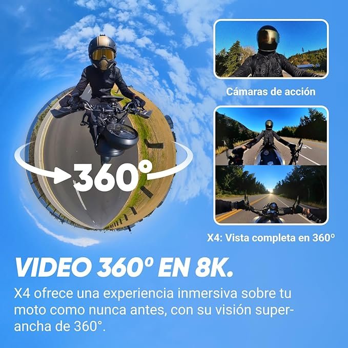 Análisis del experto: Esta es la mejor cámara 360 para moto. Su capacidad para grabar todo lo que sucede alrededor de la motocicleta elimina la necesidad de mover la cámara manualmente. Es la camara 360 para motos definitiva para quienes no quieren perderse ni un ángulo de su aventura, permitiendo reencuadrar el video una vez llegas a casa con una libertad creativa total.